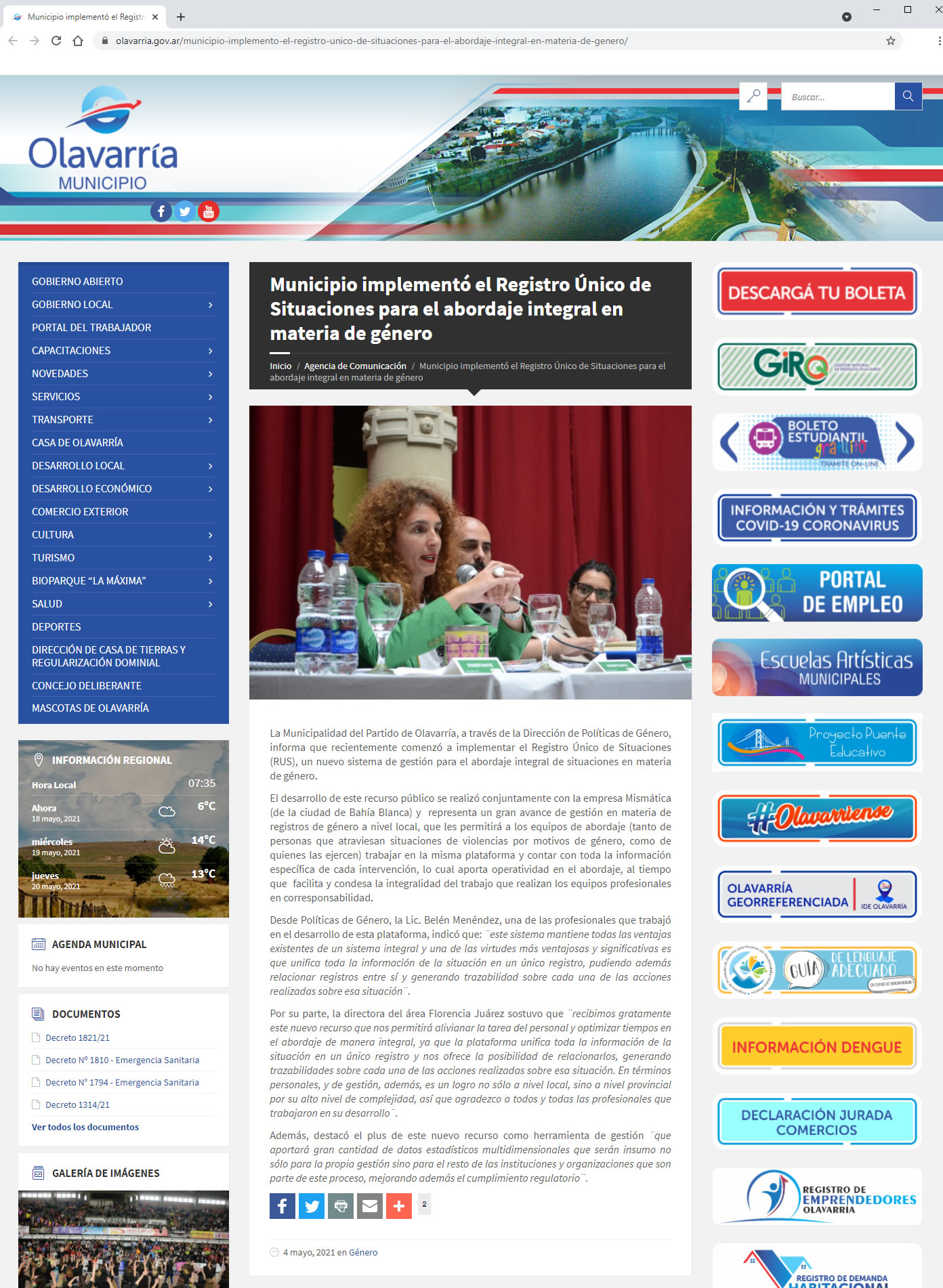 El proyecto especial de desarrollo realizado para la Dirección de Políticas de Género de la Municipalidad de Olavarría consistió en la implementación de un Registro Único de Situaciones (RUS), que contempla tanto a las víctimas de violencia como quienes la ejercen. Conforma un novedoso sistema de gestión integral para el abordaje de situaciones en materia de género y una herramienta indispensable que facilita el rápido accionar en ciertos contextos en los cuales es crucial no demorar en la resolución de los conflictos.