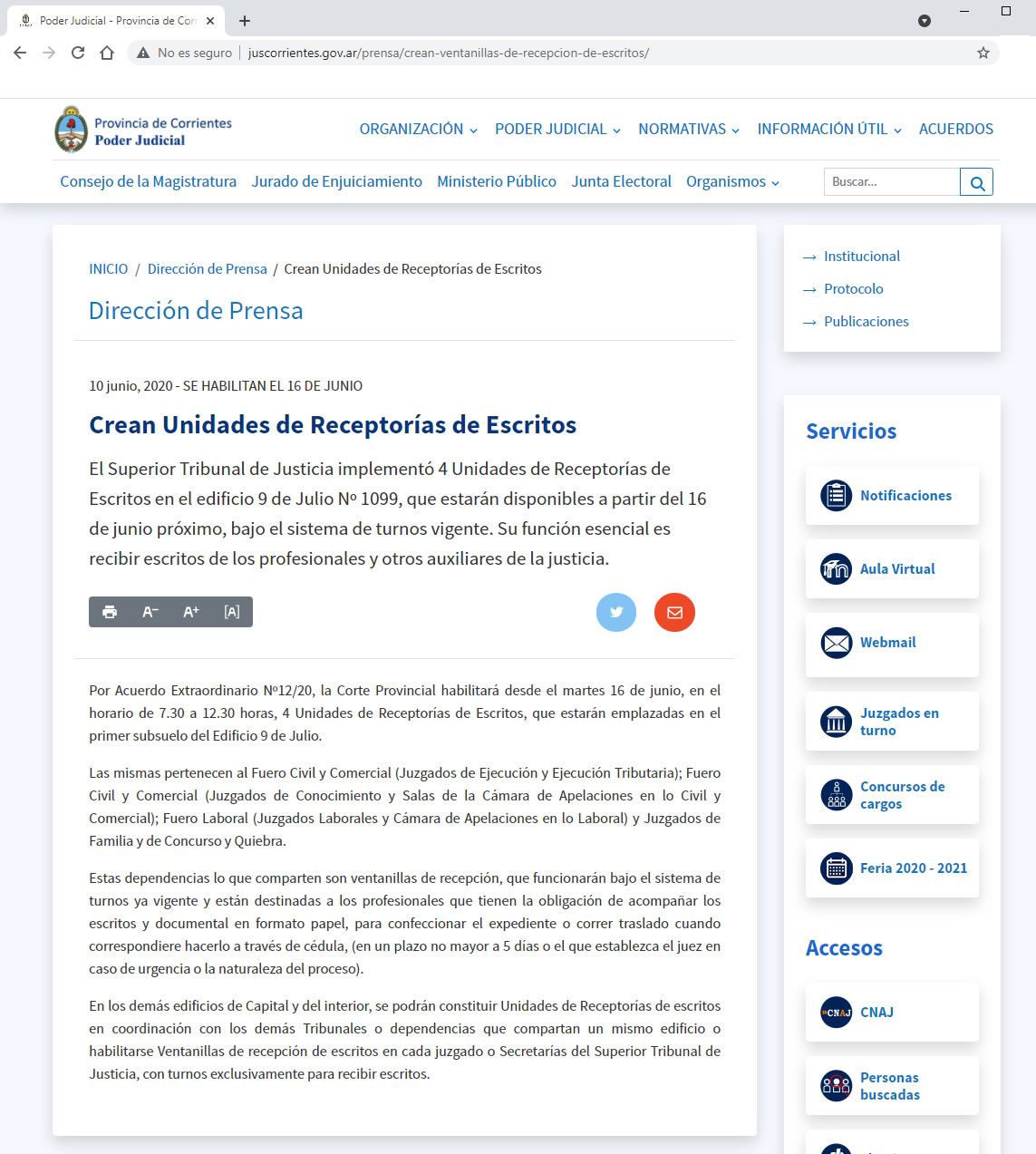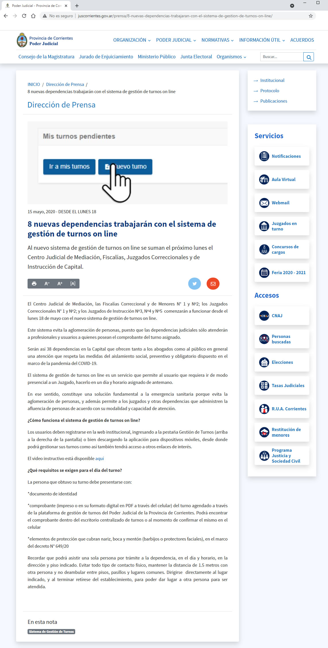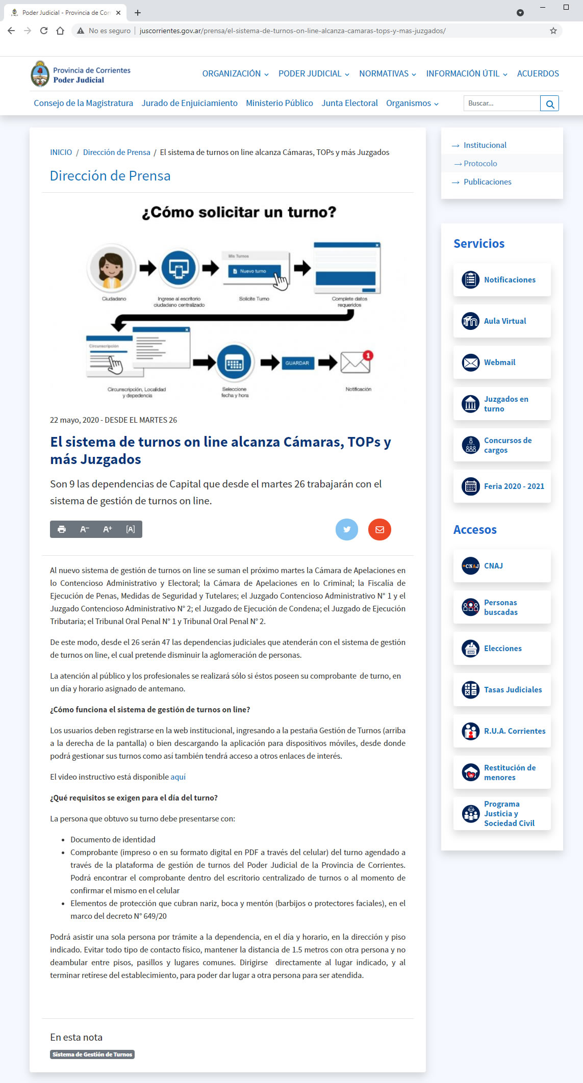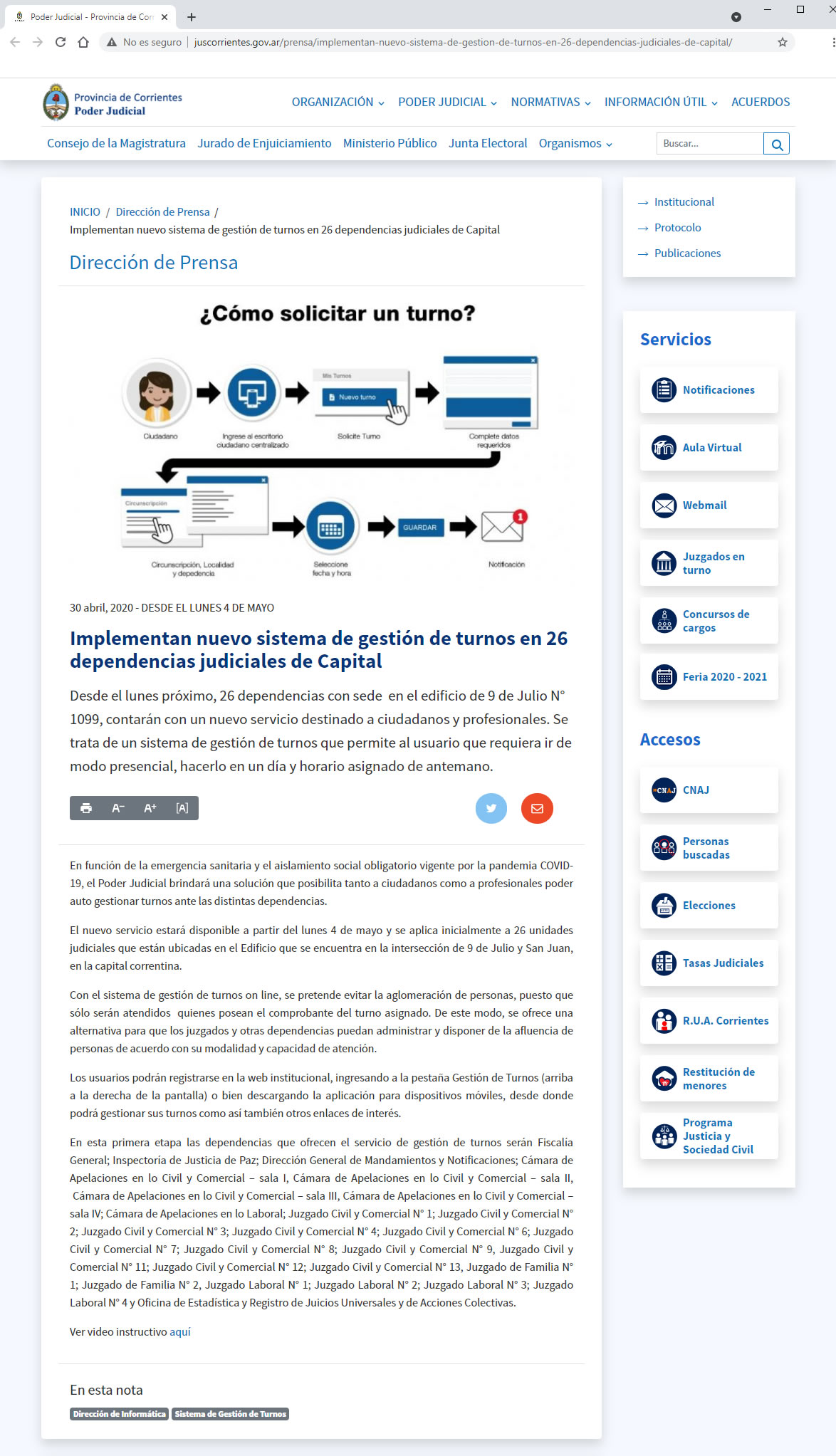 A poco más de un mes del comienzo de la cuarentena estricta por el Covid 19 (el 30 de abril de 2020) el Poder Judicial de la Provincia de Corrientes comenzó a atender de manera presencial a sus ciudadanos y profesionales. Fue gracias a la implementación de “Citymis Turnos Programados” y “Citymis Audiencias Programadas” con las cuales se estableció el control de ingresos en sus más de 260 dependencias en toda la provincia mesopotámica.