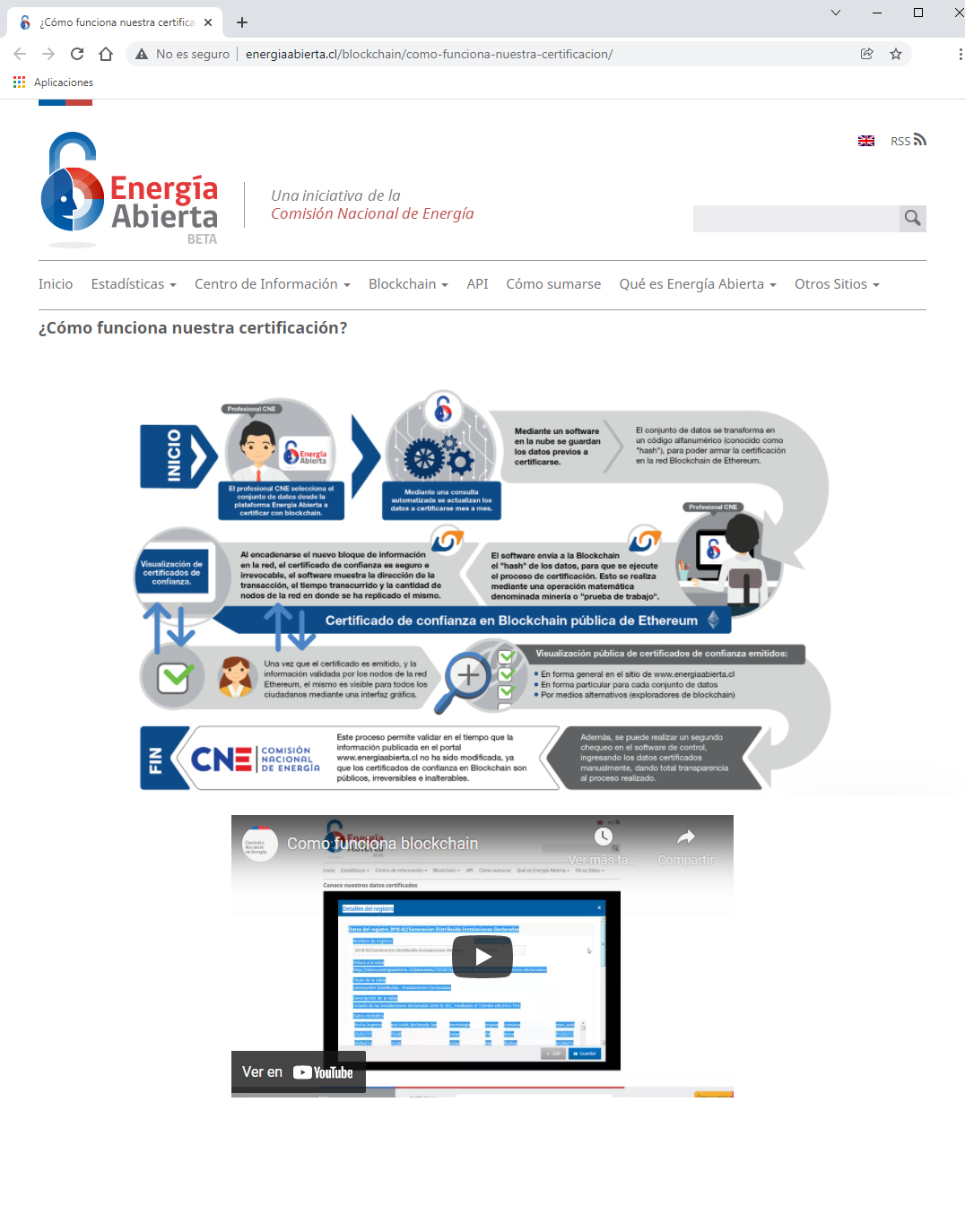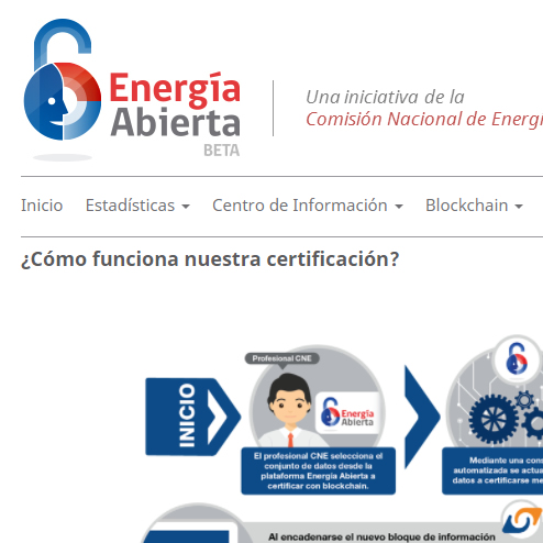 Este Ministerio de Chile nos encomendó realizar esta disruptiva aplicación sobre Blockchain, como respuesta tecnológica a la falta de confianza y necesidad de transparencia que demanda la sociedad. Desarrollamos este caso de éxito premiado mundialmente y primero en Latam para la generación de certificados de confianza en la red Ethereum que contiene los datos abiertos provenientes del portal Energía Abierta. Este proceso brinda seguridad y trazabilidad para los múltiples organismos y empresas del mercado que los consumen diariamente para la toma de decisiones de inversión en el país.