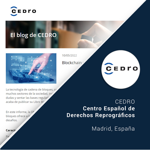 El Centro Español de Derechos Reprográficos (CEDRO) es una organización que se dedica a defender y gestionar la propiedad intelectual de libros, revistas, periódicos y partituras en cualquier medio y soporte. Desde 2019 cuenta con nuestro desarrollo en base a tecnología Blockchain en la red Europea Alastria.