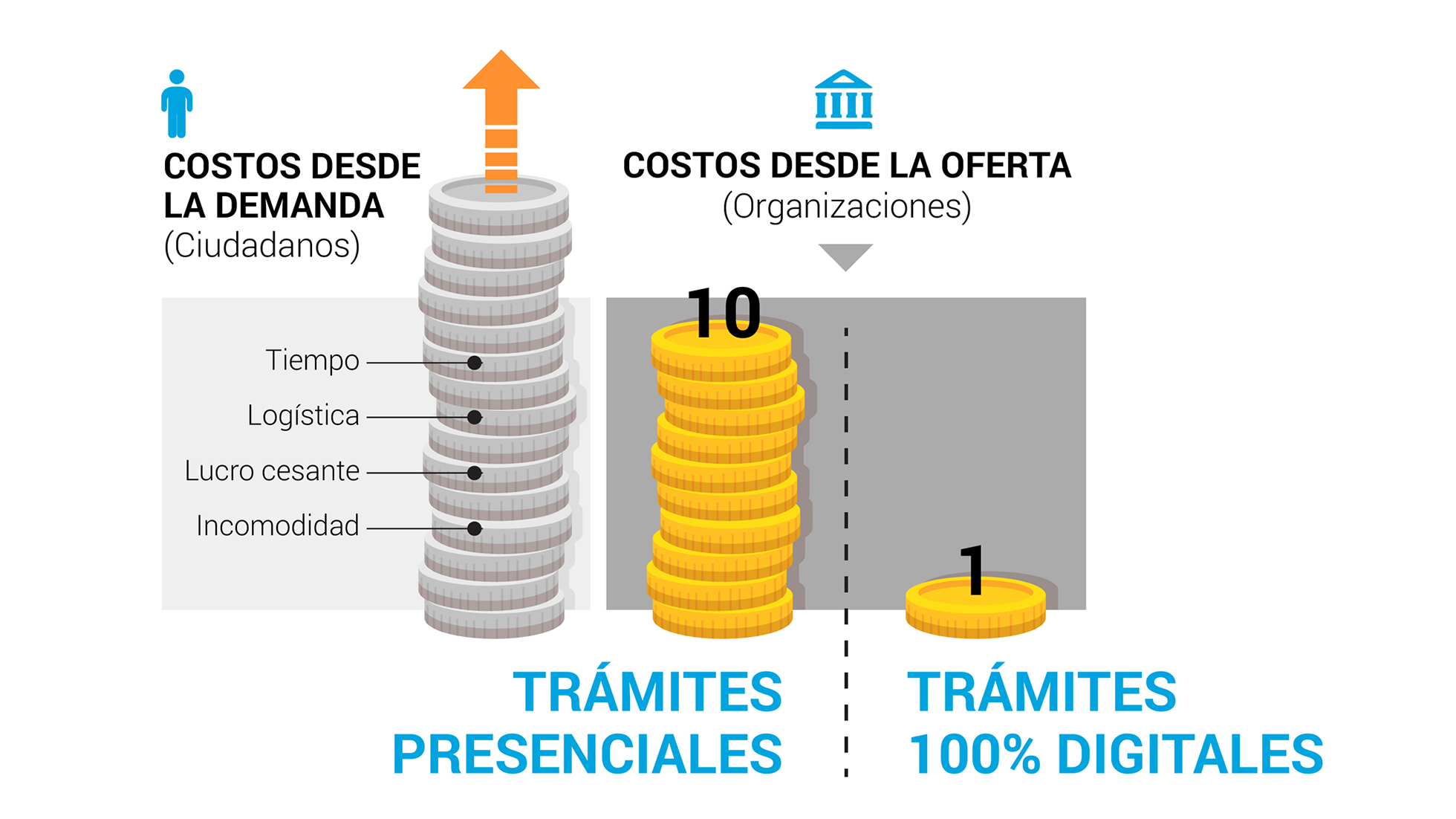 Ya hay bastantes estudios y análisis respecto de las relaciones de los costos, tanto directos para el Estado como indirectos para los ciudadanos, de las interacciones digitales versus las presenciales, como lo muestra el siguiente gráfico elaborado por la el equipo de comunicaciones de Mismatica (¡que me gustó mucho!) y ha sido realizado en base al estudio que llevé a cabo hace algunos años para el Banco Interamericano de Desarrollo.