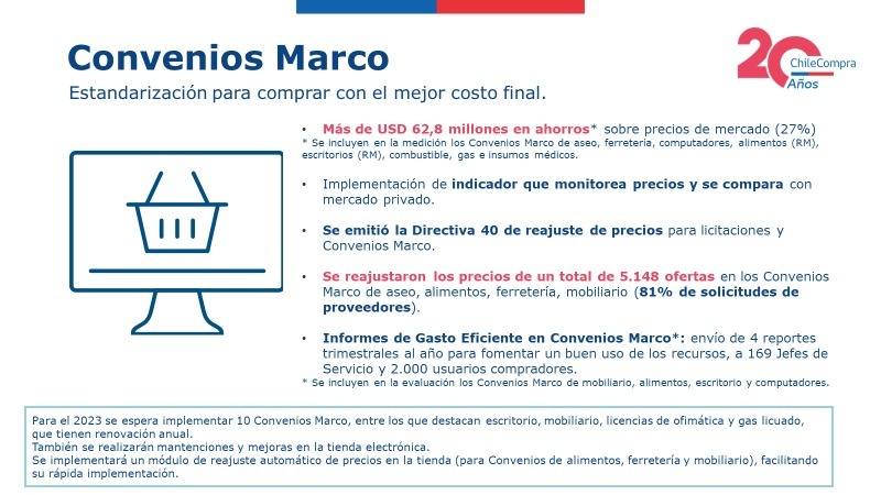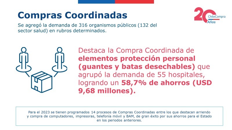 Cuando se analizan diferentes plataformas de contrataciones públicas, se identifican ahorros directos, vinculados a reducciones de precio del orden de 2,65% y los impactos en eficiencia 0,4% (estudio Does e-Procurement save the state money? de Marcos Singer et al. para el caso chileno), lo cual llevado a los montos que esas plataformas transan, son muchos millones de dólares. Sólo en el 2022 se transaron más de 15.000 millones de dólares (el 2,65% son casi 400 millones), pero si incluso lleva esta cifra a un análisis más conservador, sólo 9.200 millones de dólares correspondientes a procesos de carácter más competitivo (licitaciones), los ahorros en base a los números estimados por Singer serían de 244 millones de dólares.